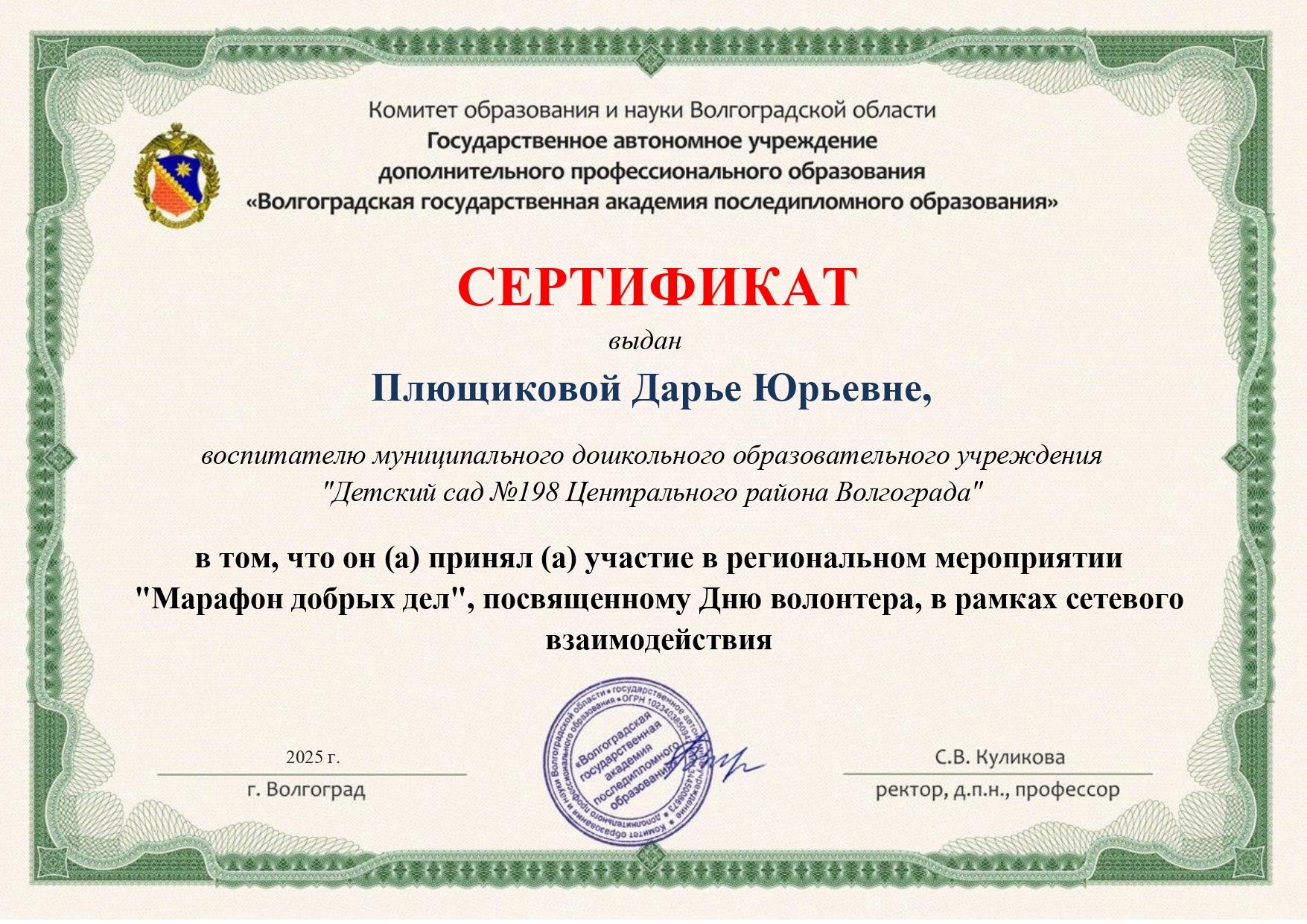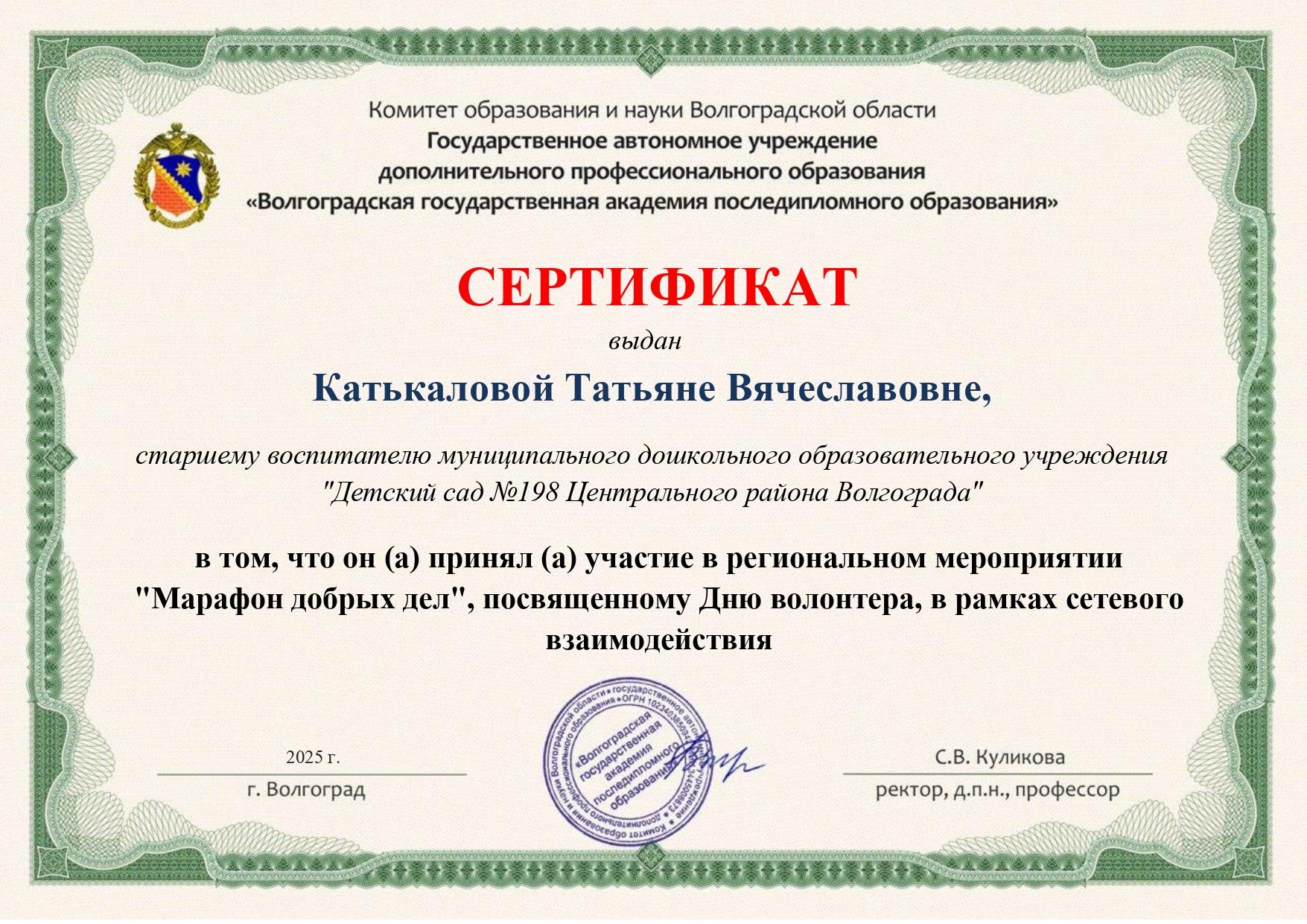 Сроки проведения: с 01.12-05.12.2025 г. Участники сетевого взаимодействия: МОУ Д/С №198 г. Волгоград МДОУ Д/С №80 г. Волжский МДОУ Д/С №98 г. Волжский МДОУ Д/С №5 г. Урюпинск МОУ Д/С №283 г. Волгоград МОУ Д/С №3 г. Волгоград В рамках "Марафона добрых дел" прошли мероприятия по вовлечению дошкольников в деятельность, направленную на благо общества, формирование у них положительных личностных качеств и мотивации к дальнейшим социальным действиям. Основные моменты марафона: Объединение усилий: марафон проходил одновременно в шести детских садах, что создало атмосферу дружбы и сотрудничества. Мы обменивались идеями и впечатлениями, а также поддерживали друг друга в реализации добрых дел. Разнообразие мероприятий: В течение недели были организованы различные акции и мероприятия: Вовлечение родителей: мы пригласили родителей принять участие в некоторых мероприятиях — это помогло создать еще более теплую атмосферу. Совместные занятия укрепили связи между детьми и их семьями. Финал марафона: в конце недели мы провидим итоги марафона. Каждый детский сад представил свои достижения, а дети создали коллажи "Добрые дела". Тематическая неделя "Марафон добрых дел" стала не только возможностью сделать что-то хорошее для окружающих, но и создать позитивную атмосферу среди детей и родителей. Проведение тематической недели "Марафон добрых дел" показало значимость совместных усилий педагогов в формировании нравственных ценностей у подрастающего поколения. Итогом недели стало создание коллажей из фотографий "Добрых дел" — отличный способ показать родителям и воспитателям, насколько активно дети участвуют в благотворительных мероприятиях и проявляют заботу друг о друга. "День волонтёра" - важное событие в календаре каждого ребёнка, формирующее положительные качества характера и прививающее ценностные ориентиры, необходимые каждому человеку в будущем. Общий итоговый ролик: Сертификаты участников: ![]() ![]() ![]() ![]() ![]() ![]() |