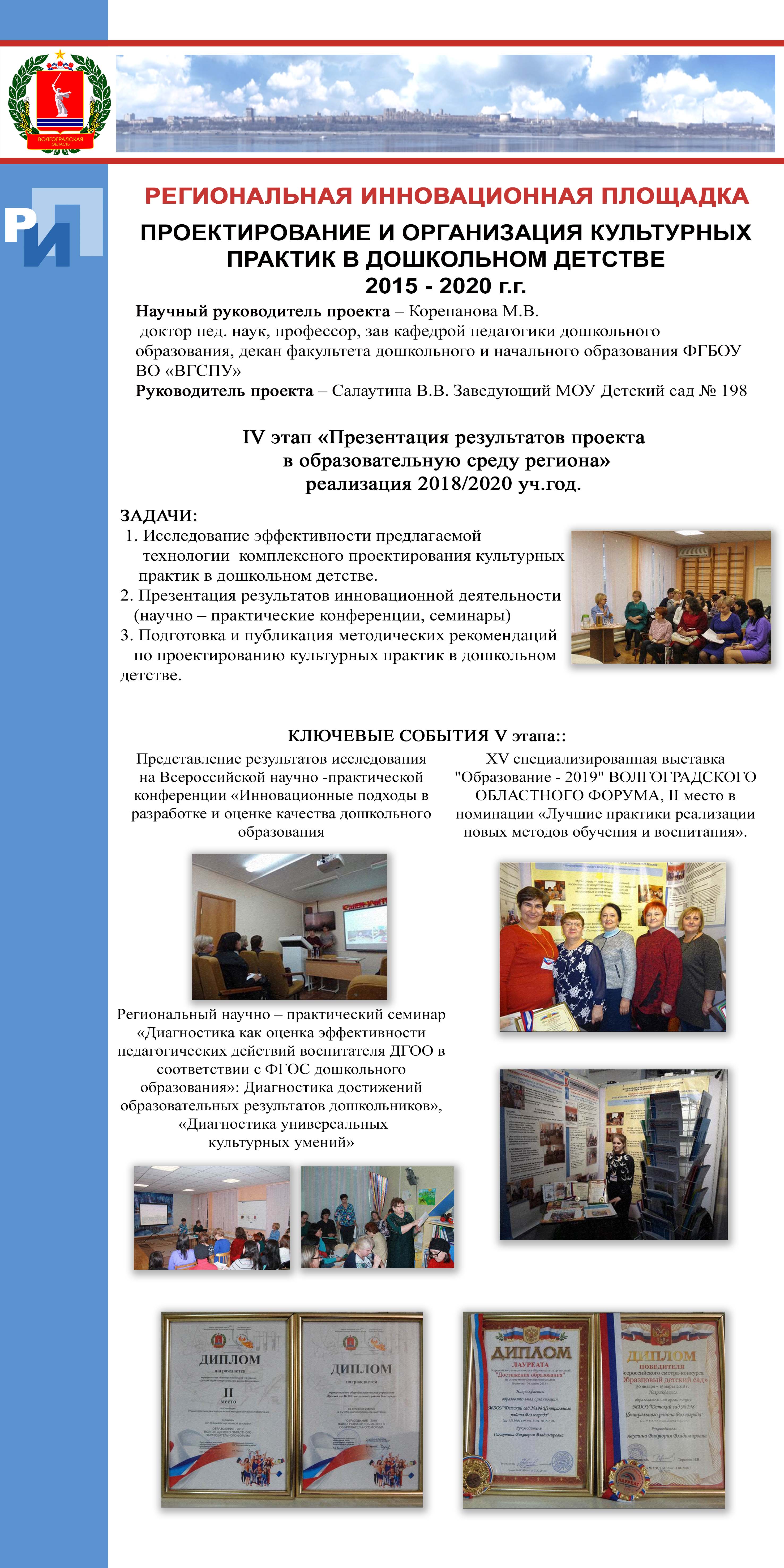 Информация (отчет) о реализации 4 - го этапа РИП 2019 - 2020 гг В рамках продолжения работы по реализации 4 этапа РИП опыт ДОУ был представлен на ряде мероприятий: Публикация статей в научно-практических журналах: РЕБЁНОК и ОБЩЕСТВО научно-практический ежеквартальный рецензируемый журнал №3 (2019 г) Дошкольное образование: культурологический подход Тема статьи "Совершенствование работы педагога в условиях использования культурных практик" (Катькалова Т.В. - старший воспитатель МОУ Детский сад №198) (ссылка на статью: http://childandsociety.ru/ojs/index.php/cas/article/view/257 ) 17 октября 2019 г. В рамках проведения первой сессии городского постоянно действующего семинара - практикума " Методическая работа как система ро созданию условий для совершенствования профессионального мастерства педагогов муниципальных образовательных учреждений Волгограда, реализующих основные общеобразовательные программы дошкольного образования" по теме "Интеграционный подход в организации образовательного процесса в ДОУ на основе культурных практик" Программа городского семинара 17.10.19.pdf 14 ноября 2019 г. Семинар - практикум в рамках реализации дорожной карты по созданию единого сетевого инновационного пространства образовательных учреждений Центрального района по теме "Интеграционный подход в организации образовательного процесса в ДОУ на основе культурных практик". Программа районного семинара 14.11.19.pdf 17 декабря 2019 г. Семинар - практикум в рамках реализации дорожной карты по созданию единого сетевого инновационного пространства образовательных учреждений Центрального района по теме "Педагогическое сопровождение культурных практик дошкольников" программа семинара районного 17.12.19.pdf 30 января 2020 г. III региональная научно-практическая конференция «Эффективные практики реализации региональных инновационных проектов» - Презентация инновационной практики по теме «Диагностика и мониторинг развития универсальных культурных умений дошкольников. Региональная научно практическая конференция.Презентация практики - Диагностика и мониторинг развития универасальных культурных умений дошкольников.pptx 14 апреля 2020 г. Вебинар «Проектирование и организация культурных практик в детском саду» . (Ведущий : Корепанова Марина Васильевна, заведующий кафедрой педагогики дошкольного образования, декан факультета дошкольного и начального образования ФГБОУ ВПО «ВГСПУ», доктор педагогических наук, профессор) Материалы к вебинару .